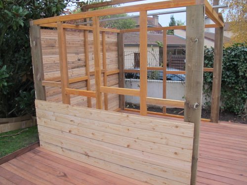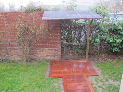 Le plancher de notre abri à vélo est une terrasse en bois, créée à fleur du sol