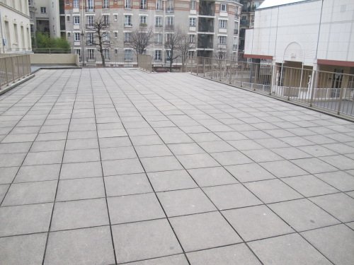 Construite au-dessus du réfectoire, le support est une étanchéité asphalte. Cette zone était auparavant couverte avec des dalles béton posées sur plots. Celles-ci ont été déposées et l’étanchéité refaite.