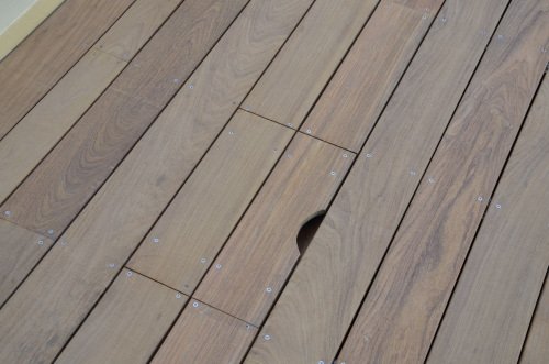 Le lendemain des photos précédentes; la lumière est différente et la terrasse en bois semble avoir changé de couleur. On observe le parfait alignement des lames sur la grande longueur. Les lames en ipé ont été vissées.