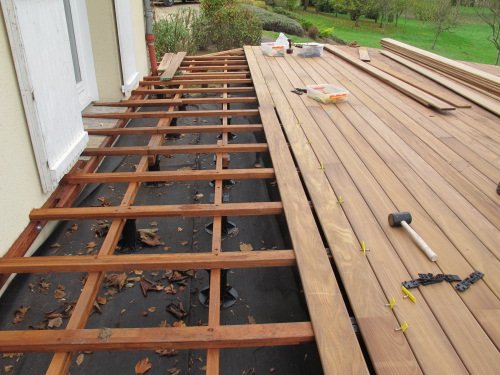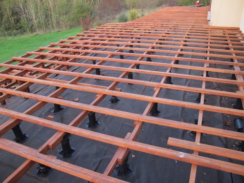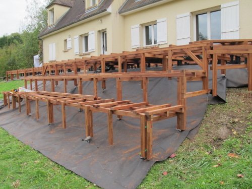Ensemble de la partie de terrasse bois posée sur plots, sur un ancien dallage. Au total ce chantier a demandé 1000 mètres de lambourdes !