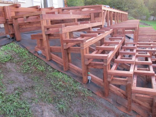 Création de la structure des gradins. La partie compliquée : aligner les gradins avec les marches, une marche sur deux