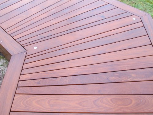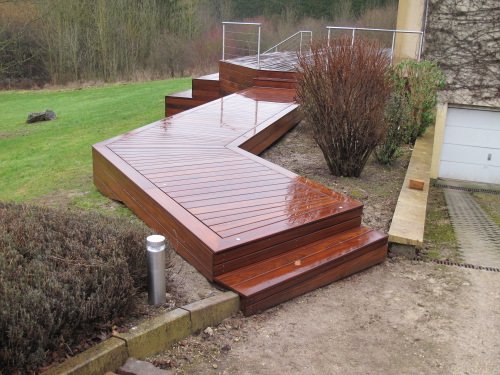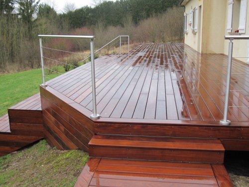 Grande terrasse en Afrormosia avec gradins et chemin, fixations invisibles Hapax