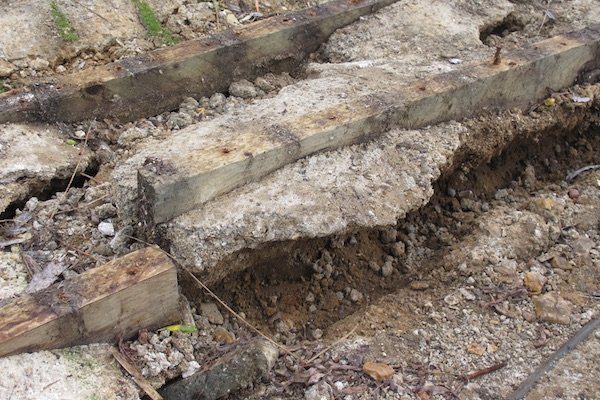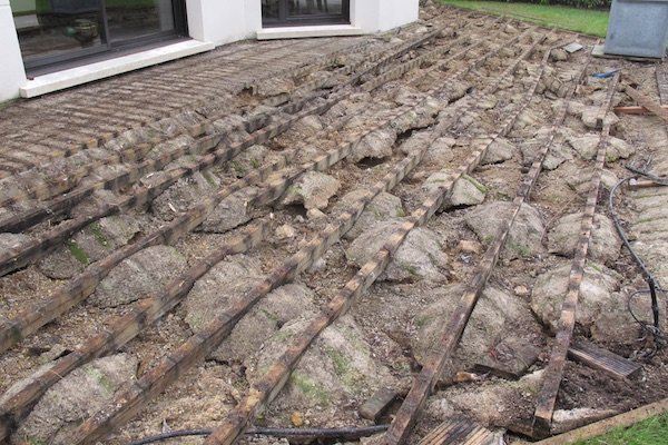 L’ancienne terrasse en bois était construite sur une structure totalement pourrie. On s’est rendu compte au démontage des raisons de cette dégradation : les lambourdes étaient coulées dans des « bouses » de béton. Cette pratique, totalement proscrite crée de la rétention d’eau au niveau de chaque plot et tout a pourri.