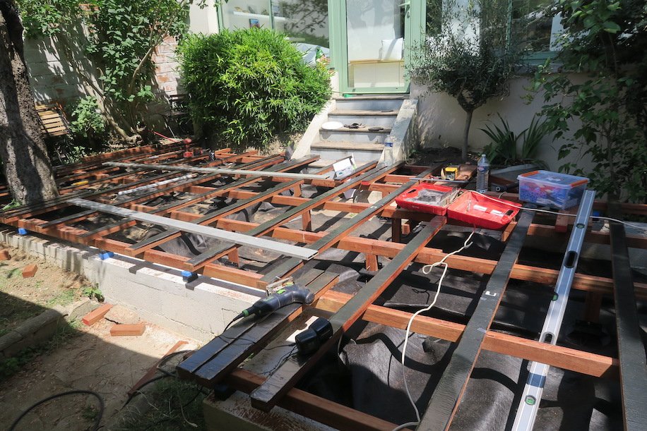 Voici la construction de la sturcture de la terrasse en bois. Nous avons créé une structure en hauteur avec une double structure de lambourdes superposées.