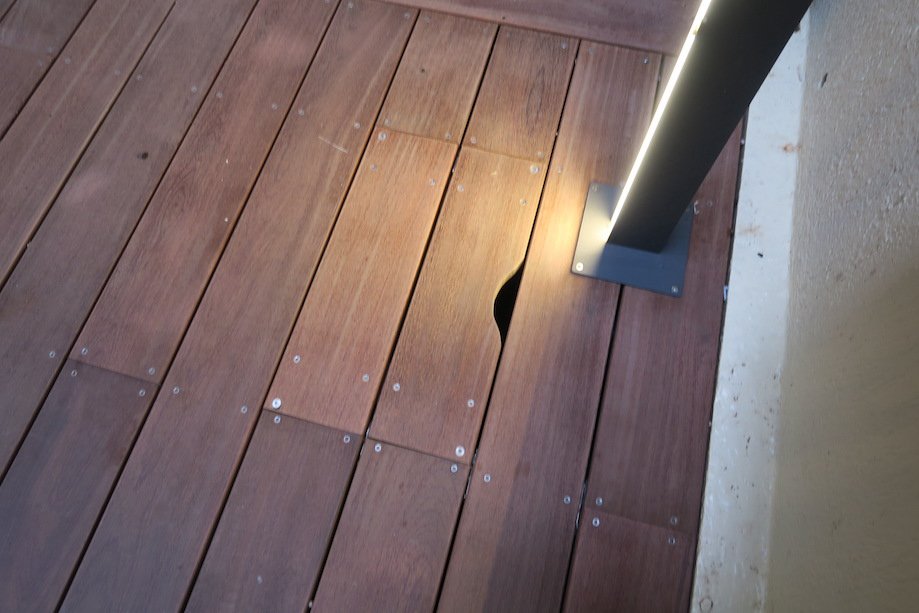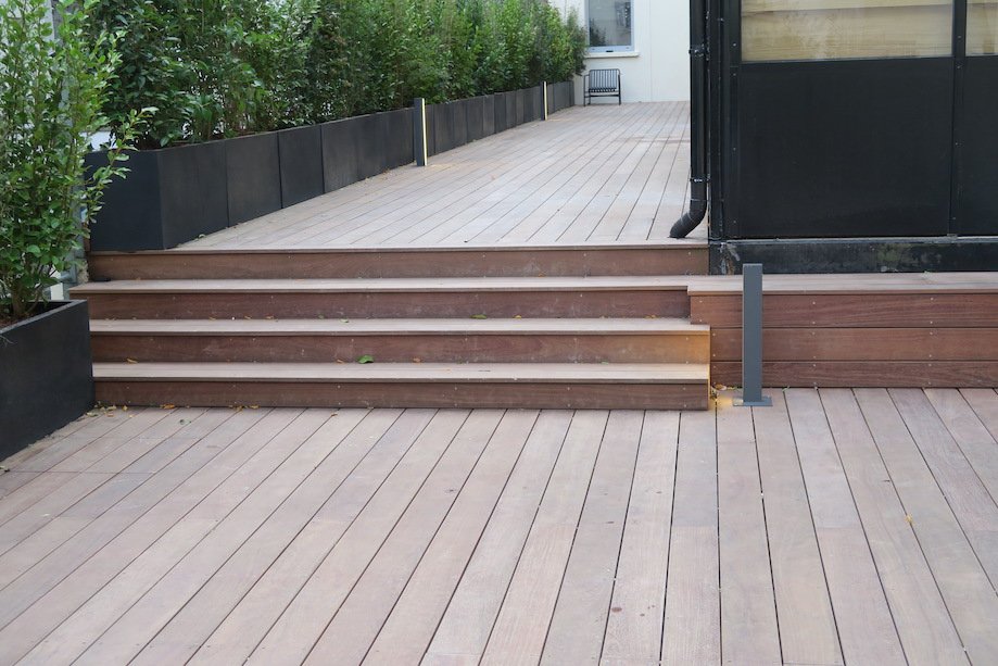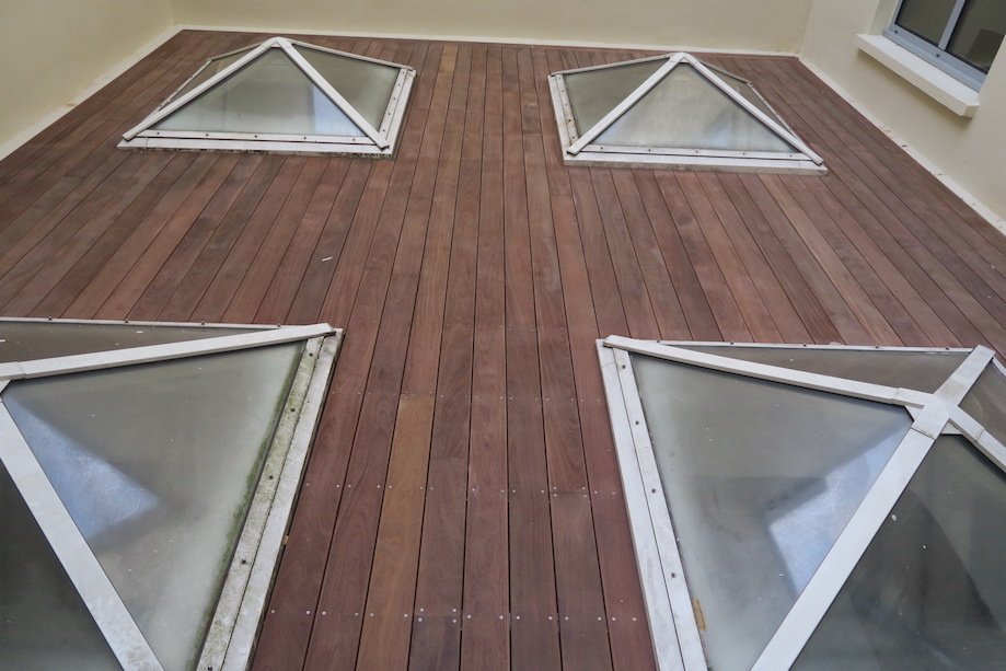 Il y avait deux autres terrasses intérieures que nous avons habillées de lames de terrasse en bois exotique en Cumaru.