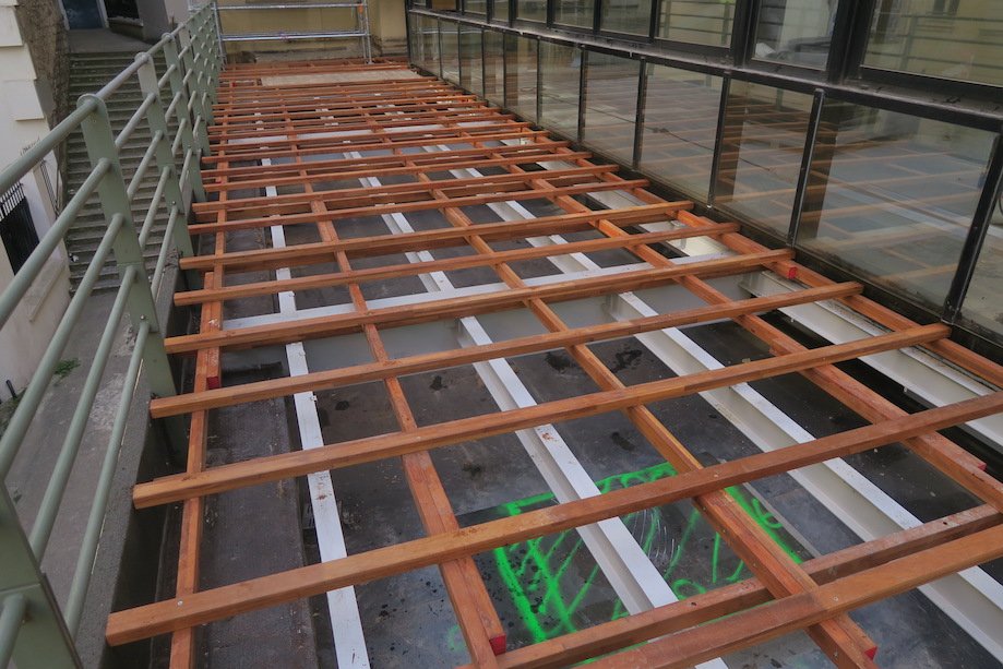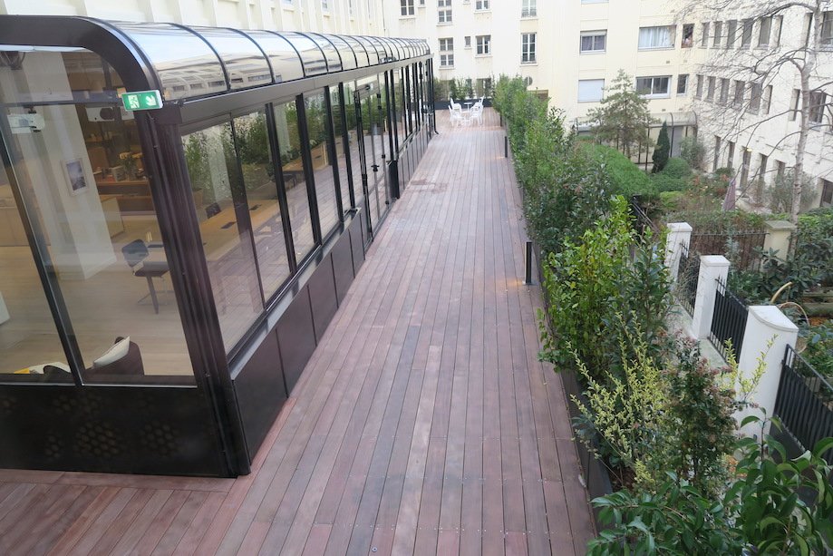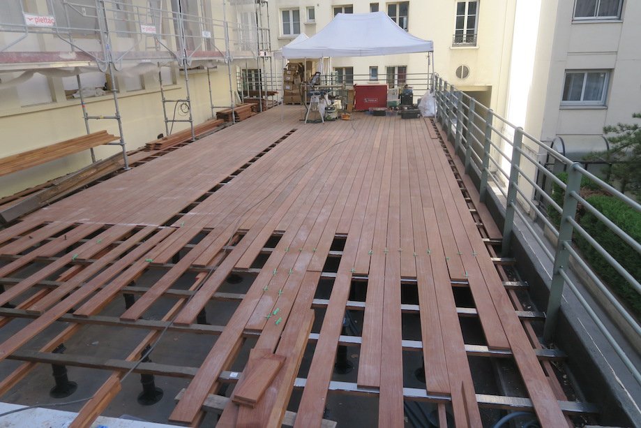Au cœur de Paris, le centre d’affaires WeWork a été construit. Nous avons été chargé, par le contractant général, de réaliser plusieurs terrasse en bois exotique, Cumaru.  La plus grande des terrasse a une surface de 300m2 et nous l’avons posé  sur des plots réglables de grande hauteur. Auparavant, nous avons fiabilisé l’étanchéité bitume préexistante plutôt douteuse,  en  mettant en œuvre une membrane d’étanchéité  EPDM sur la totalité de la surface. Ainsi, nous étions certains que l’étanchéité  serait garantie à vie.