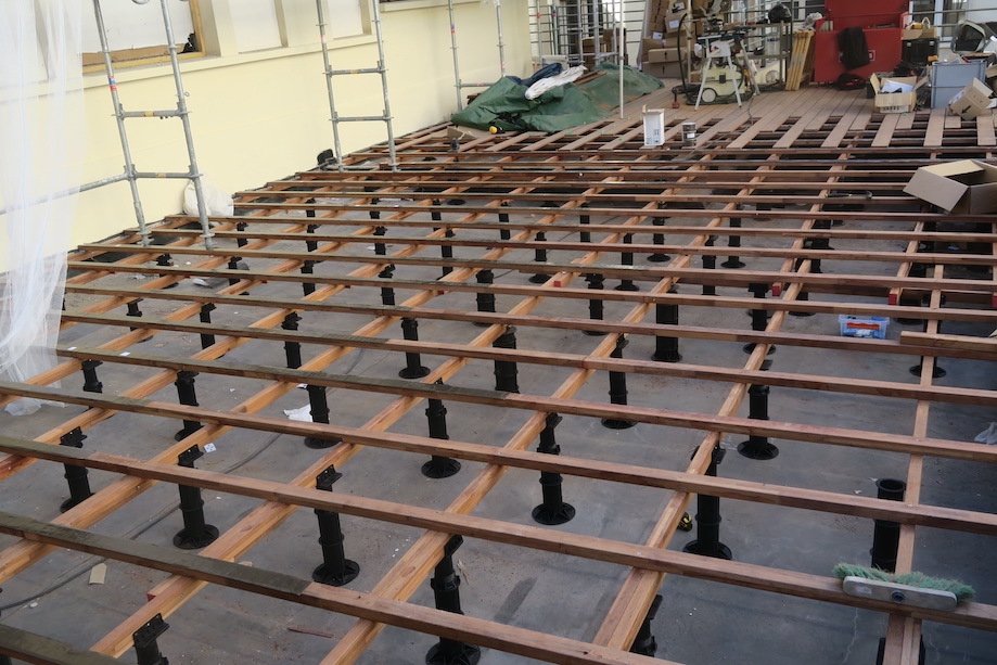 Voici la  structure de la terrasse en bois constituée de  lambourdes  en bois exotique. Il s’agit d’une double structure (deux couches de lambourdes croisées, posées et fixées l’une au-dessus  de l’autre et installées sur des plots réglables de grande hauteur). Sur les murs adjaçent, nous  avons posé des muraillères pour fiabiliser l’ensemble. Le projet n’était pas simple, comme on peut le voir sur la gauche, des  échaffaudages  étaient présents : nous avons dû constament nous adapter à la situation.