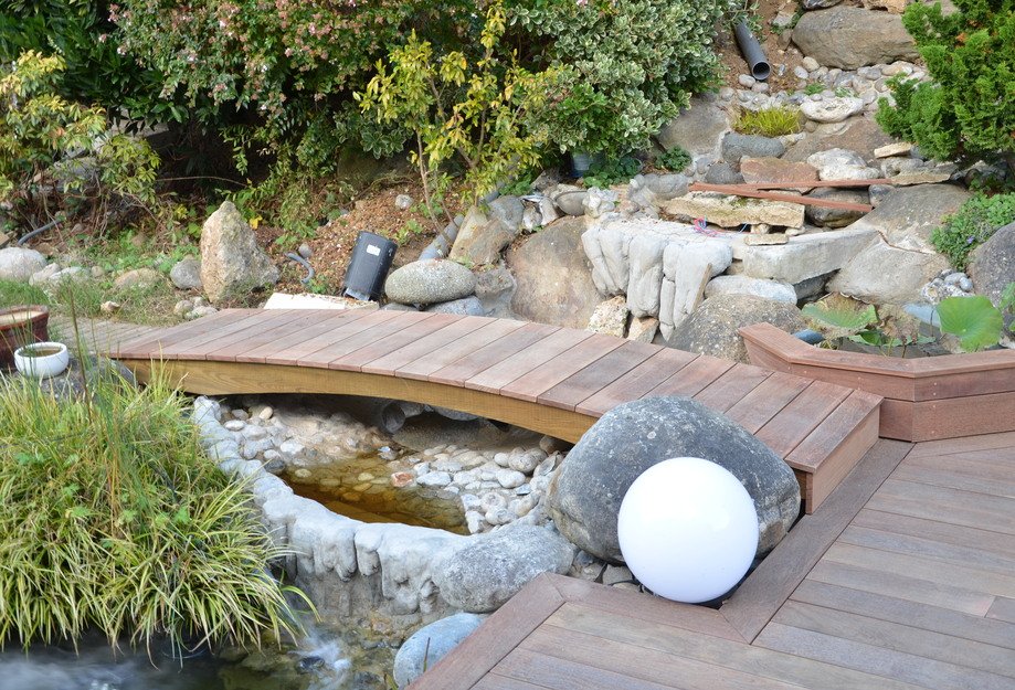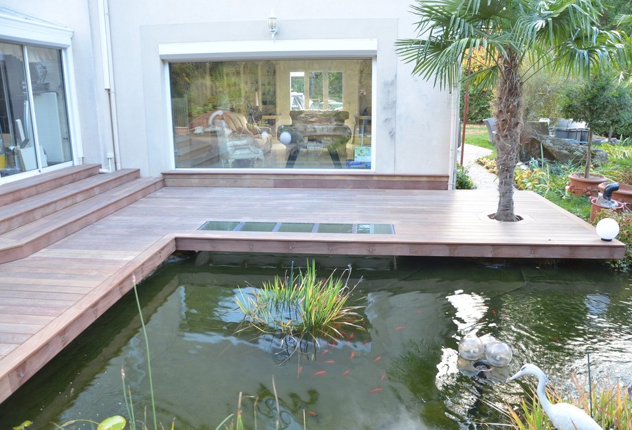 Nous avons créé une très grande terrasse en ‘essence de bois’ pour une grande maison au bord de l’eau. La terrasse possède un grand escalier arrondi qui épouse parfaitement les formes de la véranda de la maison. N’ayant pas beaucoup de terrain, cette grande terrasse en bois permet aux propriétaires de jouir plus amplement de leur extérieur. La terrasse offre un grand espace en face de la véranda et longe la maison. Nous avons intégré une longue vitre qui permet d’observer l’’intérieur de l’étang. Nous avons également créé une découpe arrondie pour intégrer l’arbre existant et nous avons créé un petit chemin en bois type jardin japonais pour accéder à une partie du terrain. L’ensemble est sublime et invite à la détente.