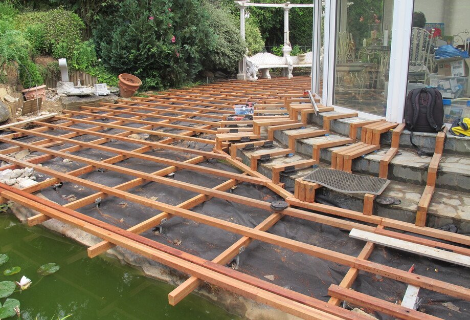 Sur cette photo, nous voyons la structure avec les lambourdes en bois posées sur l’ancienne terrasse en pierre.