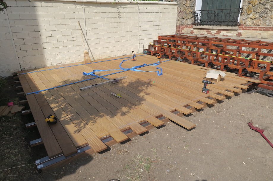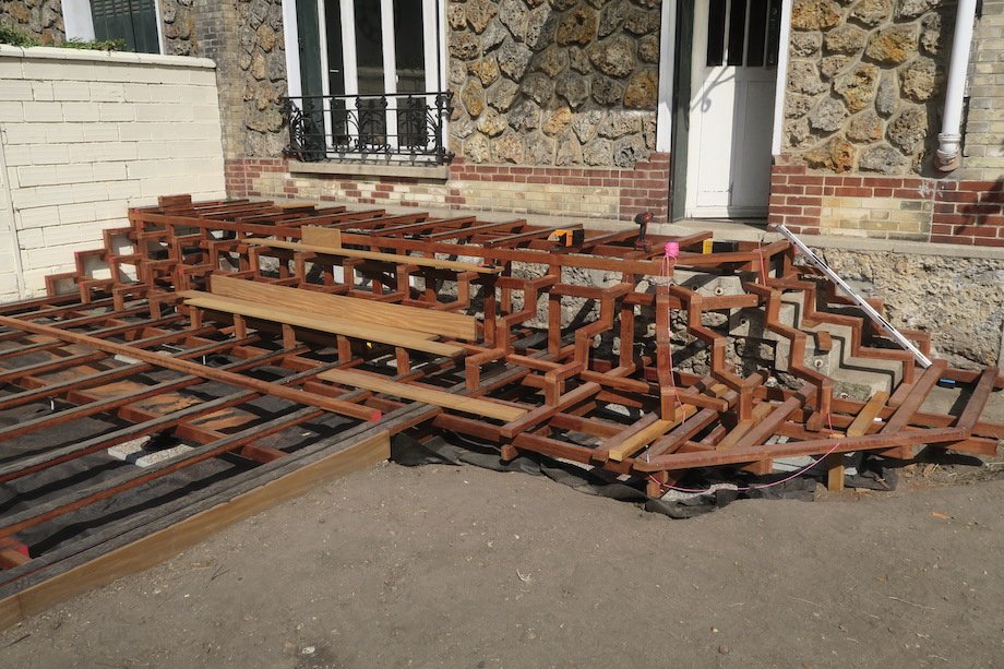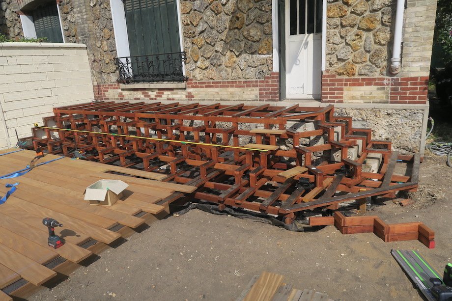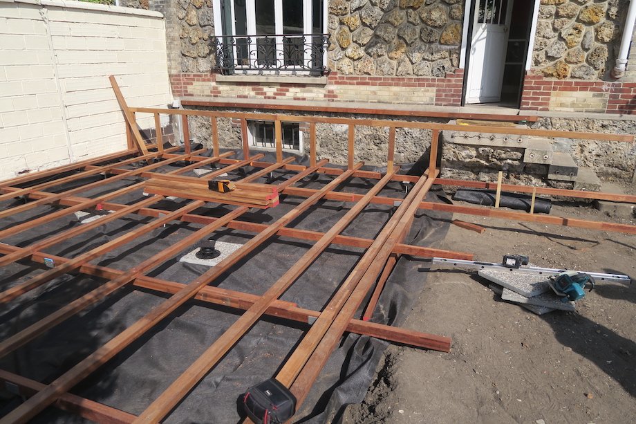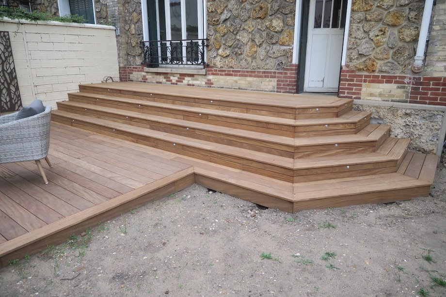 Terrasse en afrormosia sur terrain naturel en région parisienne