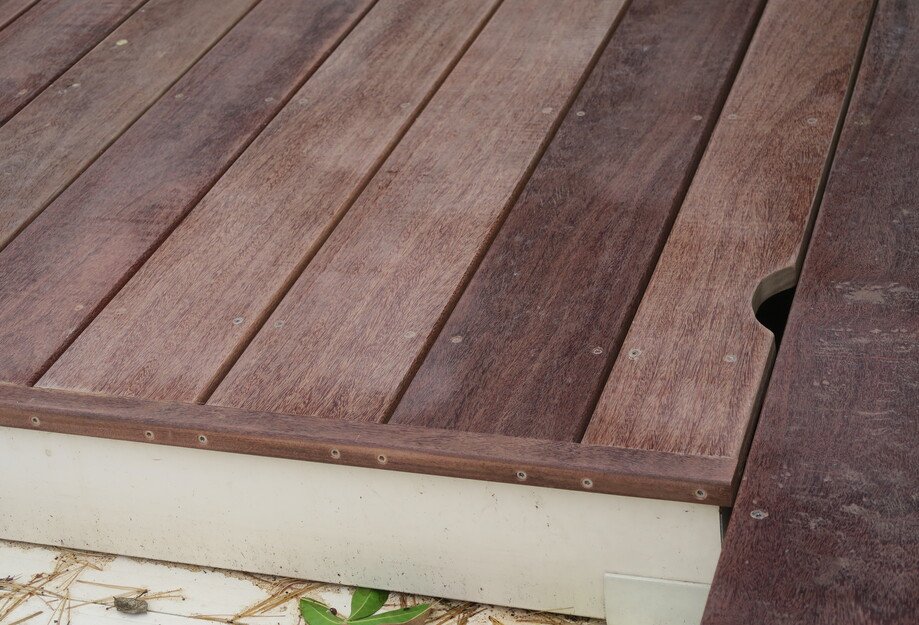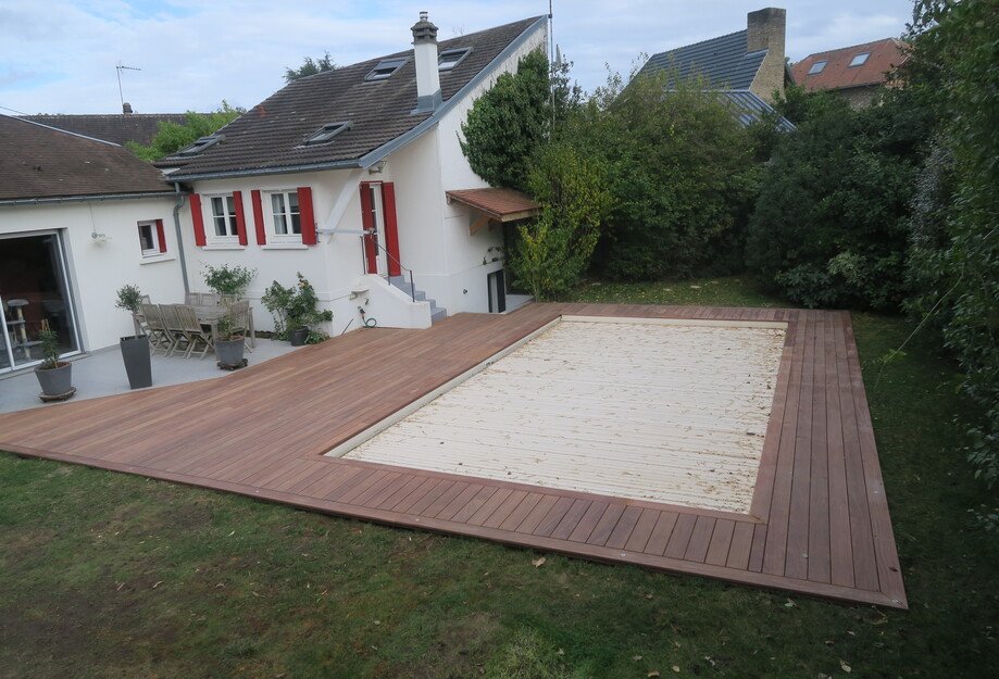 Pour cette grande maison équipée d’une piscine à fond mobile, nous avons réalisé une grande terrasse en bois exotique à fleur de jardin. Nous y avons intégré une trappe de visite permettant l’accès aux équipements techniques de la piscine. Le deck longe l’aile droite de la maison ainsi que la terrasse carrelée existante qui donne sur la baie vitrée.