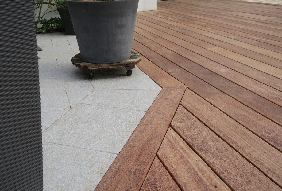 Voici une photo des lames de finitions de la terrasse en bois qui longe la terrasse carrelée existante.