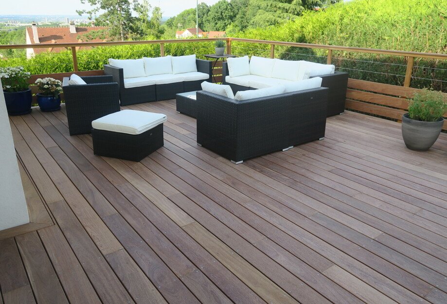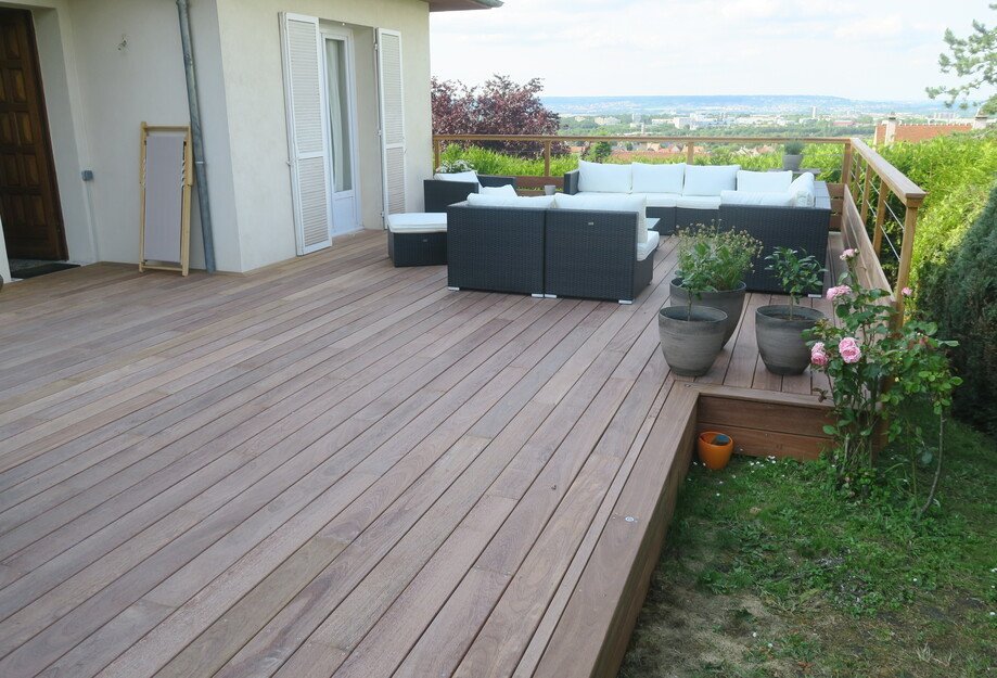 Magnifique terrasse en bois ‘exotique’ sur pilotis dans les hauteurs de la région parisienne.