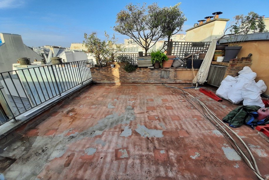 La dalle béton sous l’ancienne terrasse était recouverte d’un système d’étanchéité liquide obsolète.