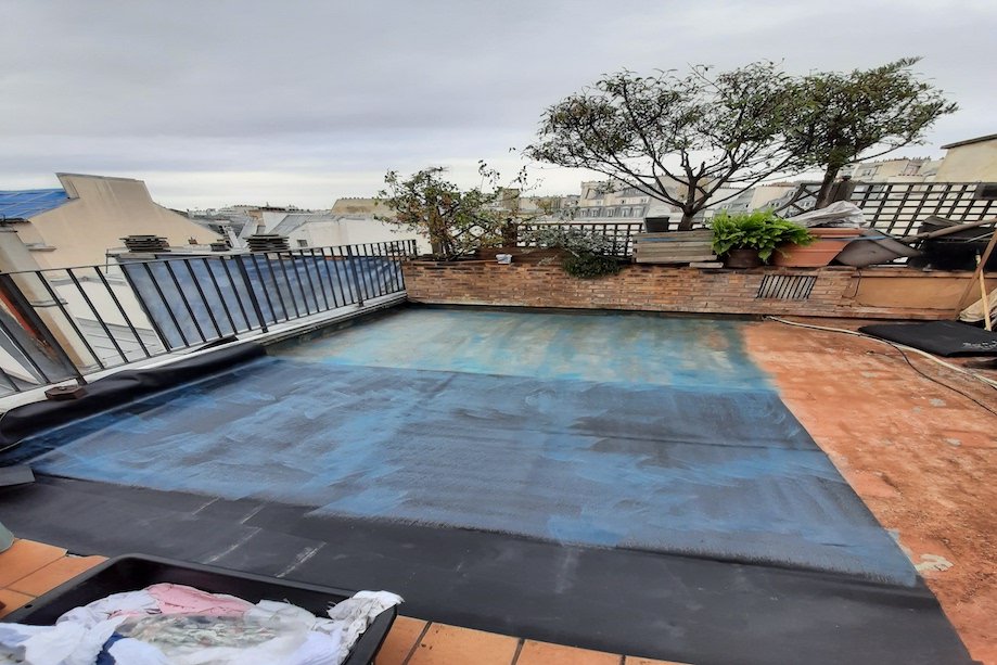 Nous avons refait l’étanchéité de ce toit-terrasse en mettant en œuvre une membrane d’étanchéité EPDM. L’EPDM est une membrane caoutchouc comme de la chambre à air. C’est un matériau 100 % étanche d’une durée de vie de plus de 60 ans.