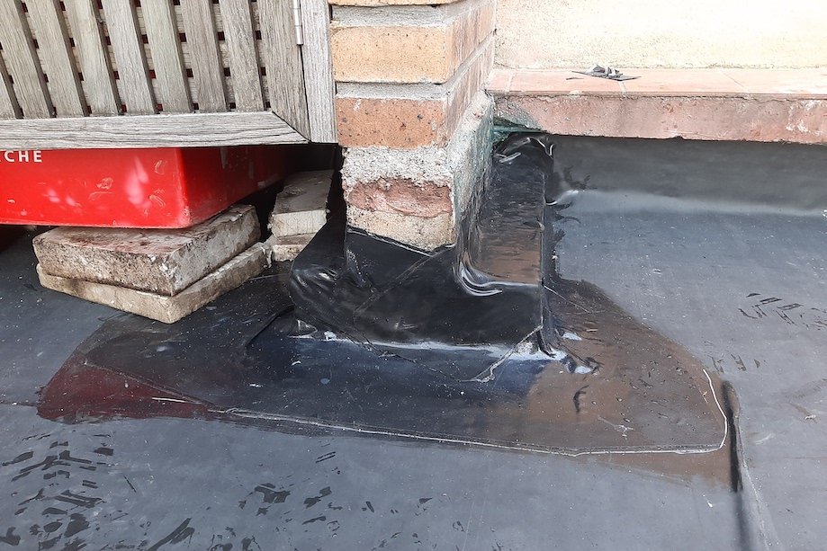 Voici un point singulier de traitement d’étanchéité avec le flashing  pour assurer une parfaite étanchéité à la terrasse.