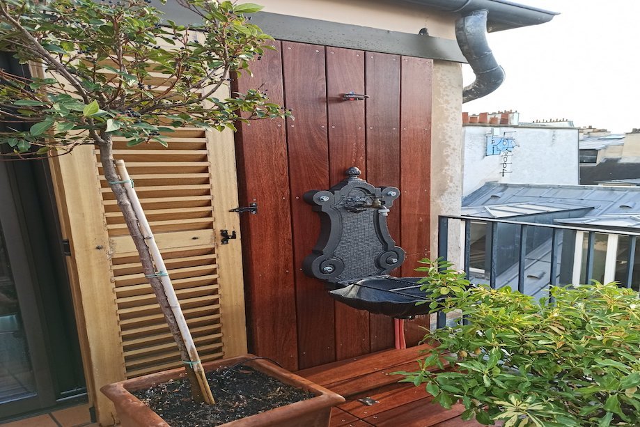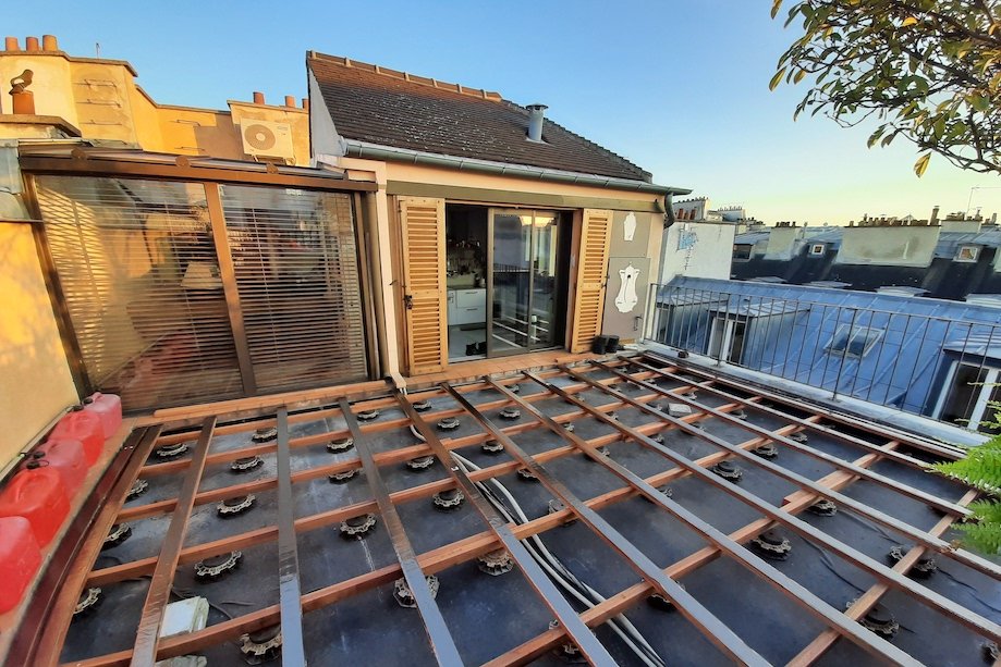 Nous avons installé une petite terrasse en bois exotique sur un toit en plein centre de  Paris. L’accès à cette terrasse était très complexe (pas d’ascenseur, cour exiguë…), nous avons donc travaillé avec une grue de toit pour acheminer le matériel.