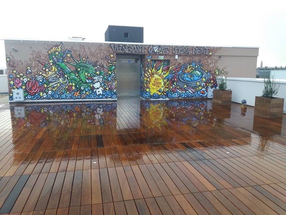 Nous avons recouvert le toit-terrasse d’un immeuble de bureaux avec des grandes dalles en bois, en Ipé afin de créer un espace terrasse agréable pour les salariés et les clients.