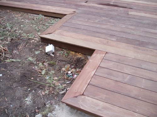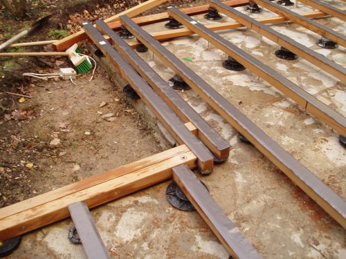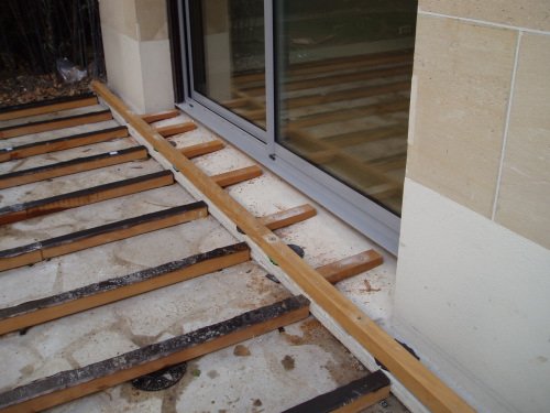 Préparation de la pose des lames de terrasse devant les appuis de