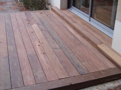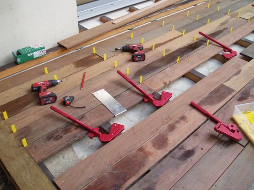 Mise en œuvre du platelage. Pose des lames de terrasse en Ipé.