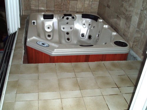 Le Jacuzzi a été intégré dans une structure en béton, carrelée.