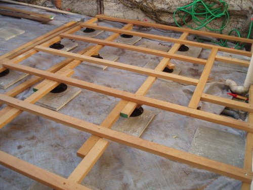 Pose sur plots réglables et mise en place d’un double lambourdage.