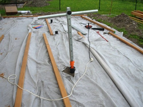 Pose du géotextile et implantation des vis de fondation avec la barre à visser manuelle.