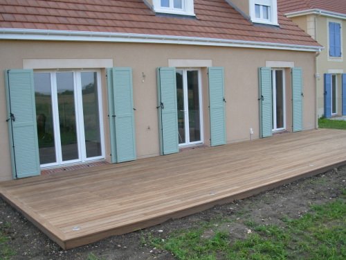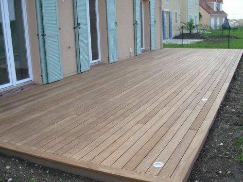 Devant cette maison « Kaufman & Broad » toute neuve, nous avons créé une large terrasse en Afrormosia.