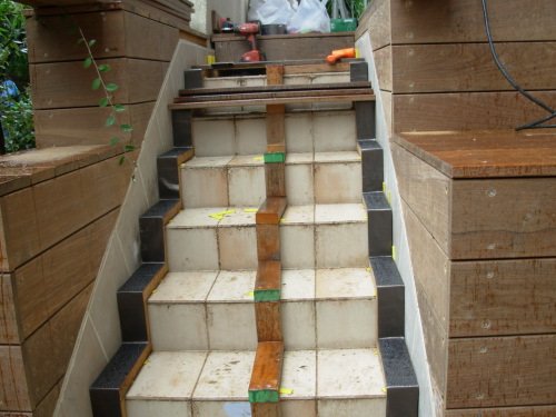 Pose de la structure sur l’escalier en carrelage où vont être vissées les lames de bois en ipé.