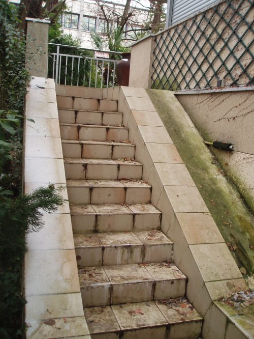 Dans ce cadre de ce beau jardin d’ombre, une terrasse et un escalier des années 80 sont recouverts d’un carrelage démodé, glissant, et vraiment peu esthétique.