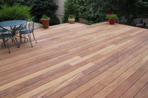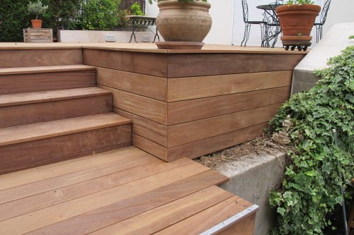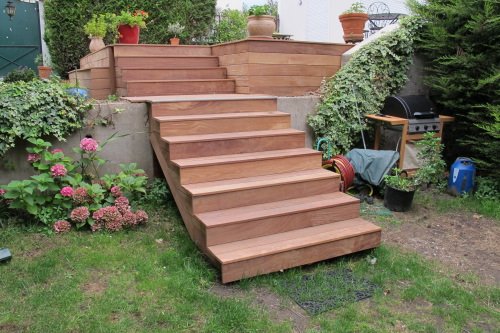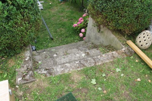 La terrasse existante en vieille pierre abîmée devait être remplacée. Cette terrasse était à 50 cm de hauteur. Nous avons étendu la surface au-dessus du jardin, à 50 cm de haut.