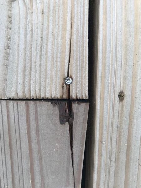 Les espacements entre les vis et les lames ne sont pas respectés. Encore une fois, c’est un travail fait à la va-vite avec des bois de mauvaise qualité et un client super déçu. Quand le client nous demande quelles solutions nous pouvons lui proposer pour récupérer la situation ; nous sommes contraints de lui dire qu’il n’y a malheureusement qu’une solution.