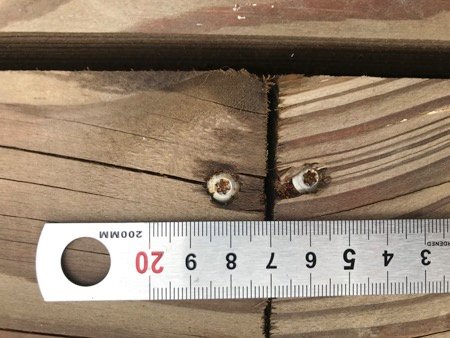 Le client nous montre les nombreux désafleurs dans la pose des lames de terrasse,soit en bout de lame soit en partie courante. Bien entendu dès que la lame se fend, la vis ne fonctionne plus et les lames se relèvent.
