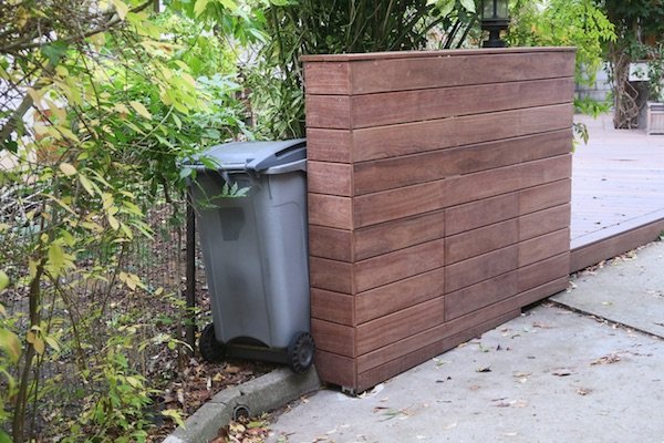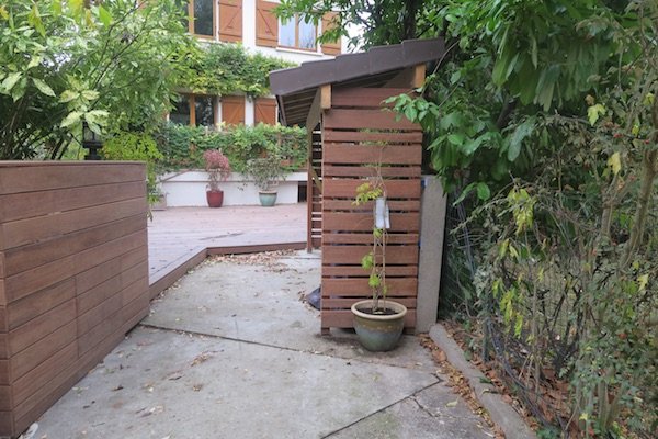 Constructions annexes : habillage des murs adjacents et autre éléments gênants avec un bardage en lames de terrasse
