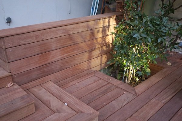 habillage avec des lames de terrasse en cumaru du muret qui faisait office de garde-corps sur l’ancien balcon en béton.