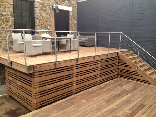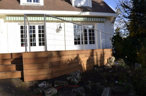 habillage du devant d’une grande terrasse en bois, qui donne sur une butte