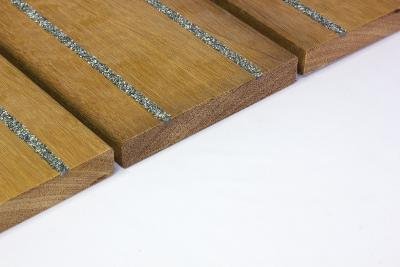 La lame de terrasse est spécialement rabotée avec deux rainures dans lesquelles cet agrégat est coulé en usine