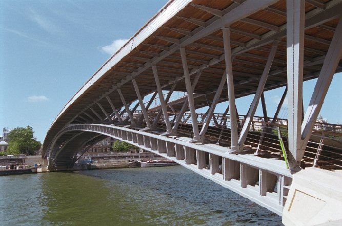 Franchissant la Seine d’une seule arche sans appui dans le fleuve, cette passerelle métallique est couverte d’ipé.