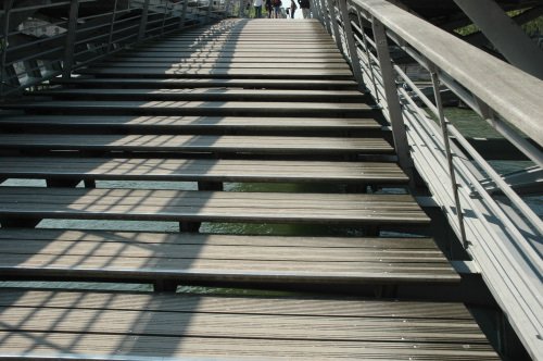 La passerelle est habillée avec des lames de terrasse en ipé, rainurées.