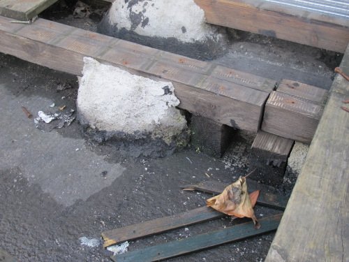 été faits au-dessus des plots béton, mais dans le vide.Evidemment ça ne tient pas, l’artisan a donc pensé à caler les lambourdes avec des cales en bois, posées à même l’étanchéité. La dernière des choses à faire.