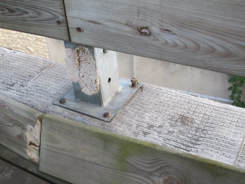 (on suppose que l’artisan n’a pas réussi à percer le ferraillage. La dernière lame de terrasse, aurait due être fixée sur l’embase métallique des poteaux du garde-corps. On suppose que c’était trop compliqué à percer. La lame a donc été collée sur la platine. Et a fini par se décoller. Il fallait d’y attendre