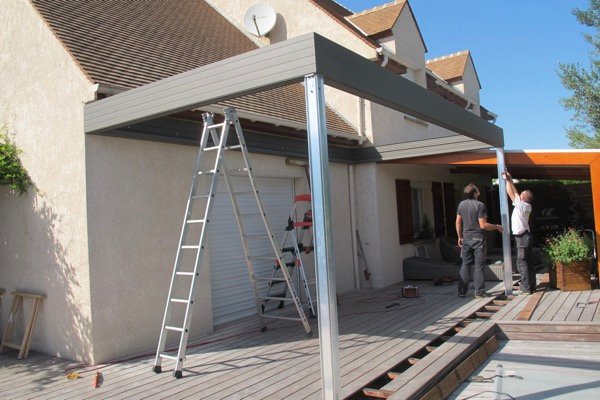 Belle pergola bioclimatique haut de gamme installée contre la maison