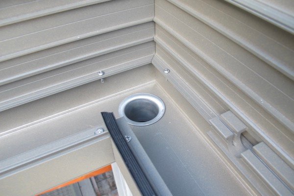 La pergola bioclimatique récupère les eaux de pluie qui sont évacuées, à travers une évacuation d’eau pluviale qui elle-même descend dans le poteau et est récupérée sous la terrasse.