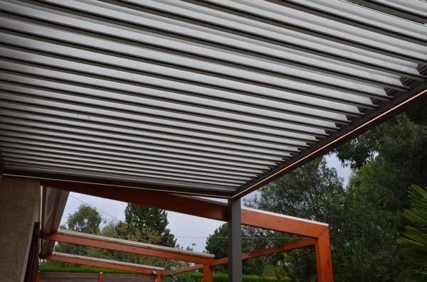 Voici la sous-face de la pergola bioclimatique avec les lames en position fermées, nous avons un joli plafond en aluminium thermolaqué, inaltérable à vie et 100% étanche.