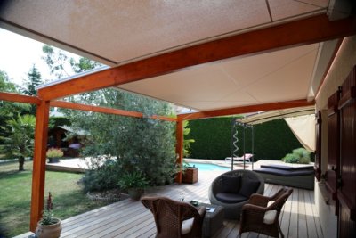 Voici le confort apporté par cette pergola bioclimatique. La terrasse en bois est protégé des intempérie si nécessaire mais également du soleil.