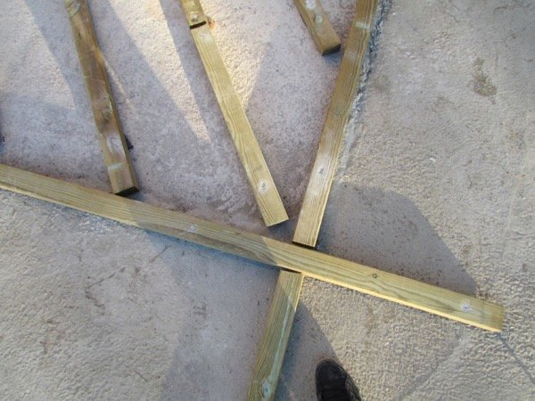 Lorsqu’on construit une terrasse en bois la base est de ne pas poser les lambourdes a même le sol, surtout pour des lambourdes en pin traité. Nous sommes exactement dans le cas de figure de ce qu’il ne faut absolument pas faire : des lambourdes posées au sol, sans ventilation, elles vont baigner dans l’eau durant toute leur vie qui sera malheureusement très courte. Une terrasse posée dans de telles conditions ne durera pas plus de 3 ou 4 ans.