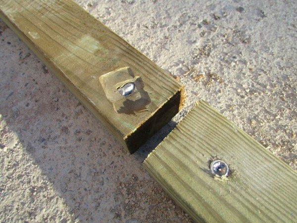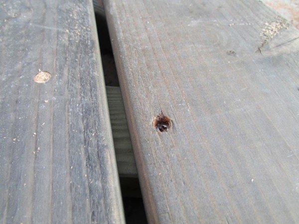 Le festival continu.L’espace entre les deux lames est beaucoup trop important, il s’agit d’un bois résineux qui va vraisemblablement continuer de sécher et donc l’espace va continuer d’augmenter. On risque de se retrouver sur cette terrasse de bois avec des écarts de facilement 2 cm entre les lames. De plus on voit que la vis a été enfoncée beaucoup trop, ce qui fait un trou, provoque de la rétention d’eau et nuit autant à l’esthétique qu’a la durabilité.