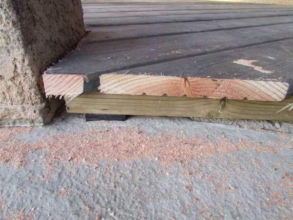 L’exemple type de la terrasse en bois réalisée n’importe comment. On ne sait pas trop ce qu’il s’est passé dans la tête de l’artisan qui a entrepris la pose de cette terrasse mais il a décidé de la tailler à la hache. Finalement il a fait toutes les erreurs qui étaient possibles de faire. Voyons ça dans le détail…
