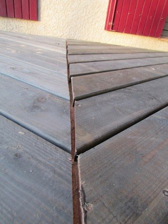 Sur cette dernière photo on retrouve notre finition approximative, que ce soit sur l’espacement des lames, leurs ralliements, la coupe centrale, bref c’est une terrasse en bois qui non seulement ne va pas durer longtemps, mais a toutes les raisons de rendre son propriétaire neurasthénique.
