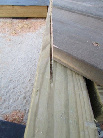 Sur cette lame de terrasse, nous voyons un coup de scie circulaire qui a entaillé la lambourde en pin, ce qui nuit à sa durabilité. En d’autres termes cette lambourde va se dégrader extrêmement rapidement à cause de cette entaille. De plus, l’espace résiduel sur la gauche de la lambourde est insuffisant pour poser une deuxième lame. Toute cette finition est à refaire.